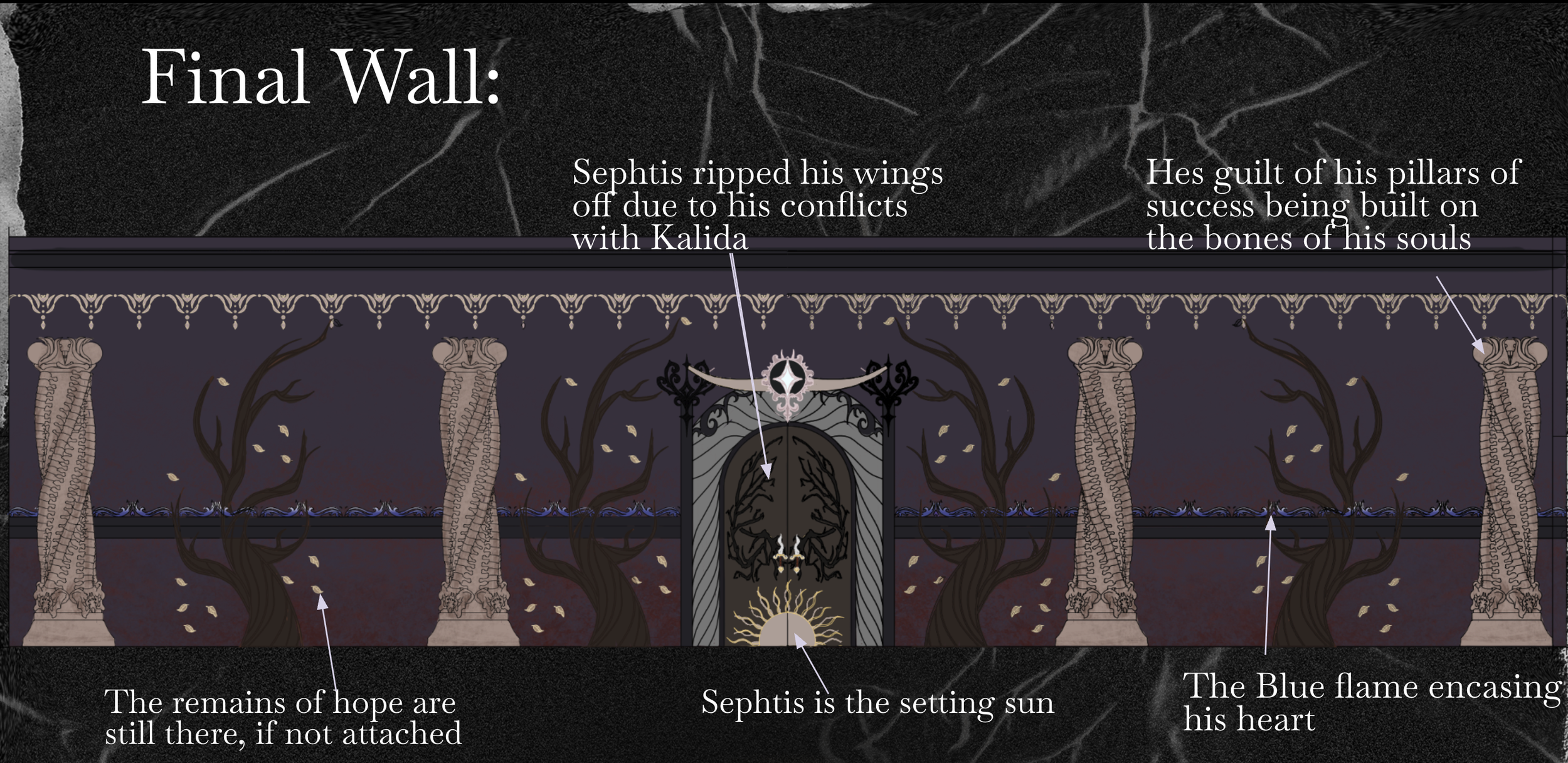 My aim was to create a ballroom wall with themes of Death, Second Chances, Forgiveness, Love